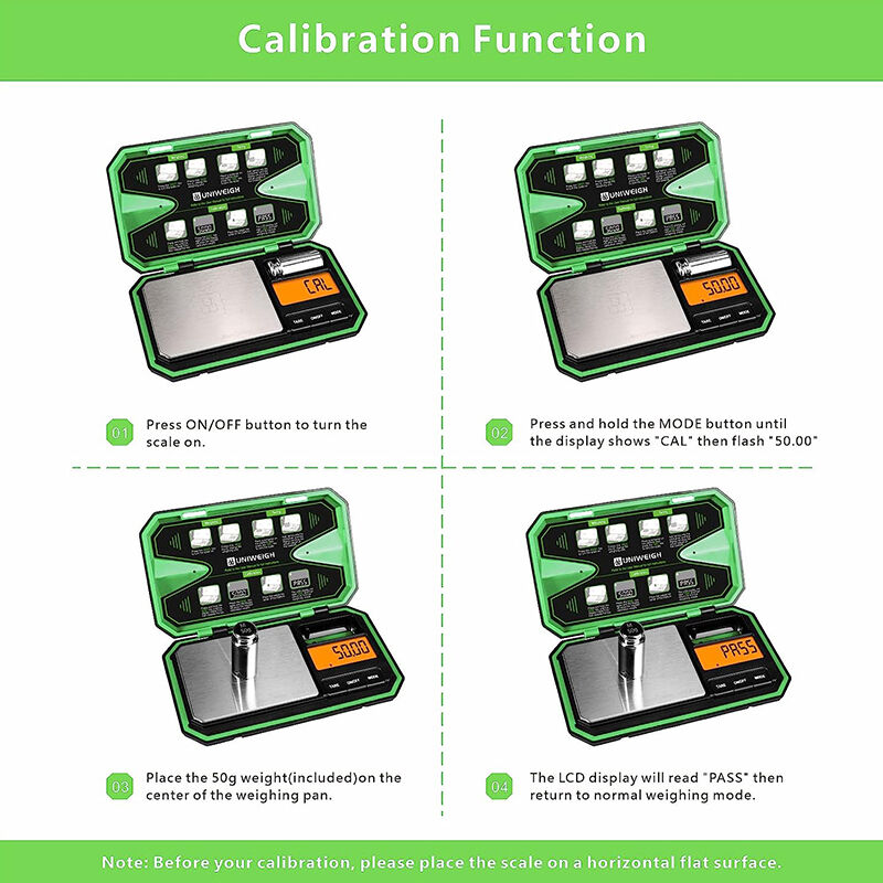 Place the 50g calibration weight on the platform; the display will show “PASS” when complete.