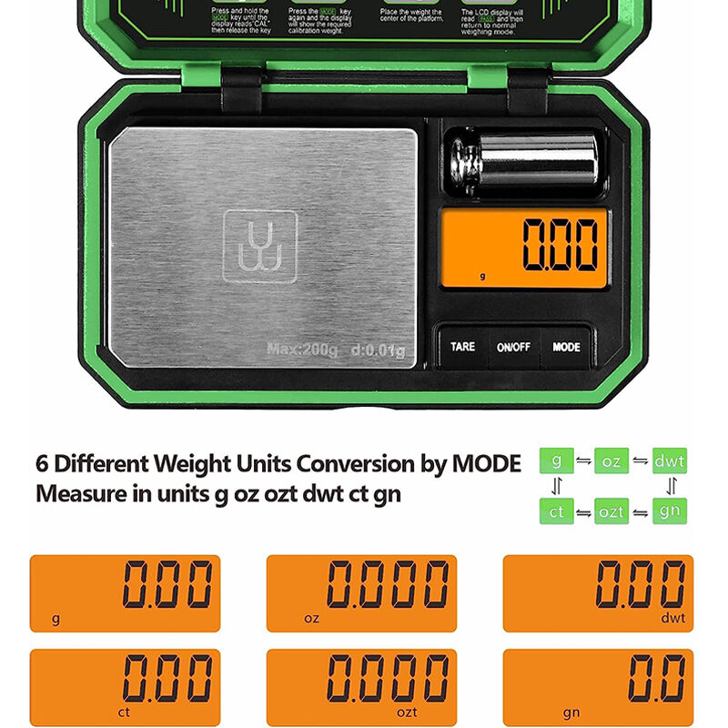“Mode”: Switches between 6 units (g, oz, ozt, dwt, ct, gn) to suit niche hobbies or global recipes.
