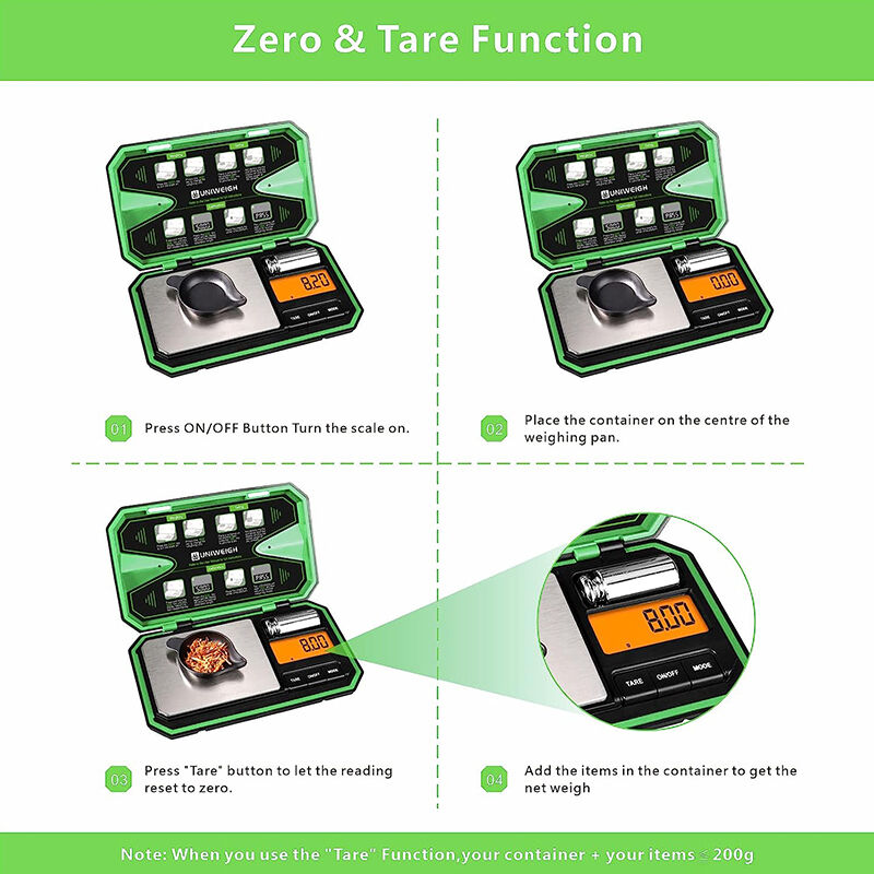 “Tare”: Zeros out container weights to measure ingredients directly in dishes or vials.