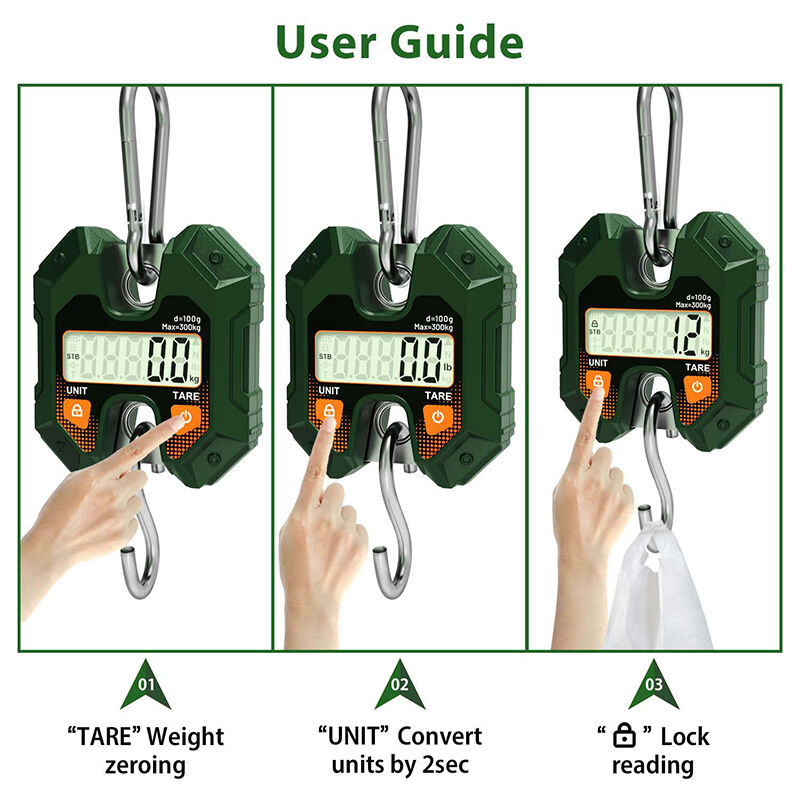 “Tare”: Zeros out the weight of hooks, bags, or containers—critical for measuring the net weight of items.