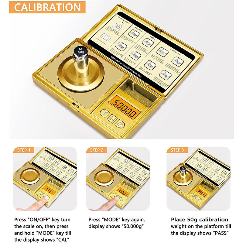 Place the included 50g weight on the platform; the display will show “PASS” when calibrated.