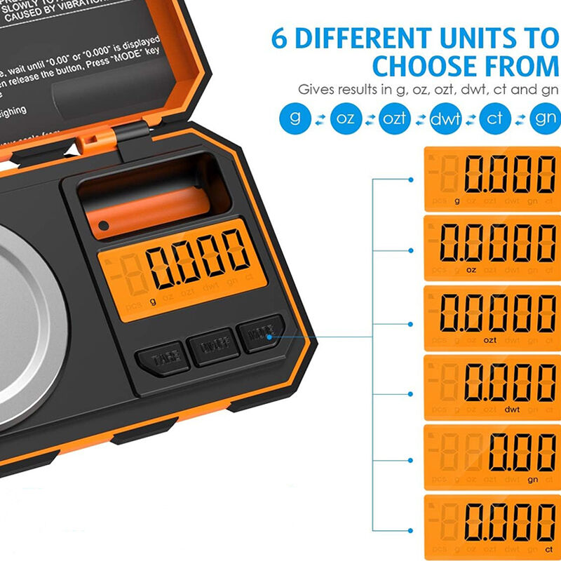 “Mode”: Switches between 6 specialized units (g, oz, ozt, dwt, ct, gn) to suit niche tasks (e.g., “ct” for gemstones, “ozt” for jewelry).