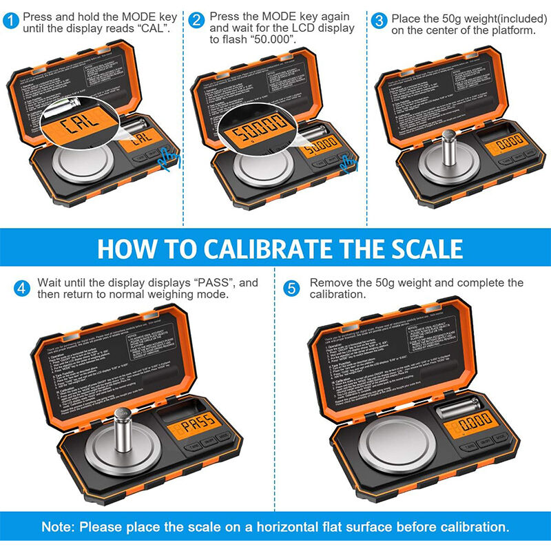 Place the 50g calibration weight on the pan; the display will show “PASS” when complete.
