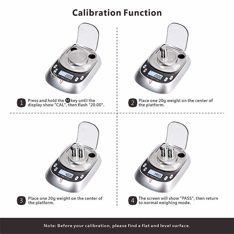 A:Calibration ensures long-term accuracy: (1) Press and hold the CAL button until “CAL” appears on the display (followed by “20.00”). (2) Place one 20g weight on the center of the platform. (3) When the display flashes “40.00,” add the second 20g weight. (4) The screen will show “PASS” once calibration is complete, then return to normal weighing mode. Note: Calibrate on a flat, level surface every 2–3 months or after moving the scale.